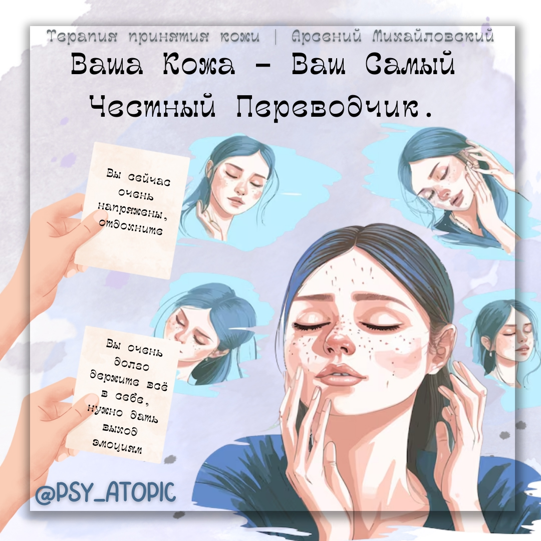 Это рубрика «Практика дня». Короткие упражнения и идеи, которые можно применить прямо здесь и сейчас, без подготовки. Сегодня поговорим в теме терапии принятия кожи. 📢 Кожа как аварийный клапан: потливость и зуд — голос вашей нервной системы Миф, который пора давно развеять: "Потливость и зуд — это просто физиология, ничего больше". На самом деле, эти телесные проявления могут быть не просто случайностью, а бессловесным криком вашей нервной системы, сигнализирующим о внутреннем напряжении. 💬 Как точно подмечает психоаналитик Отто Фенихель: "Кожа — место аварийной разрядки напряжения". Наша кожа действительно является своего рода "предохранителем", который берет на себя избыток эмоционального и нервного напряжения, в особенности, когда мы не находим других способов его выразить. Рекомендую В следующий раз, когда вы почувствуете внезапный зуд или усиленную потливость, вместо того чтобы просто игнорировать это или искать чисто физиологическое объяснение, попробуйте задать себе вопрос: