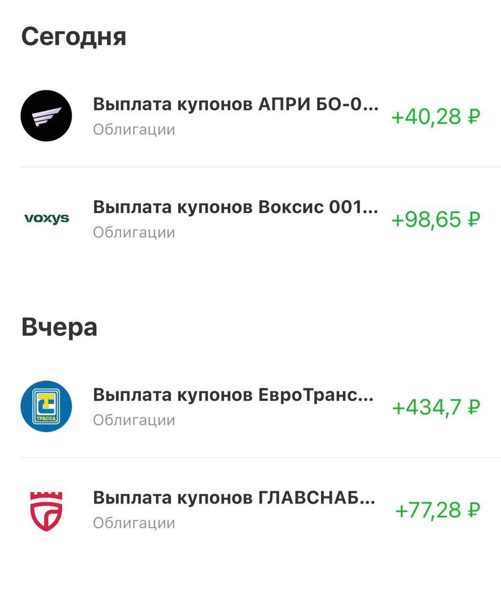 🔹 ЕвроТранс $RU000A10BVW6 Купон: 23% Доля в портфеле: 13% 🔹 ГЛАВСНАБ $RU000A10CSR0 Купон: 23.5% Доля в портфеле: 2.7% 🔹 Воксис $RU000A10BW39 Купон: 24% Доля в портфеле: 4% 🔹 АПРИ $RU000A10E5C4 Купон: 24.5% Доля в портфеле: 1.5% 💼 Портфель находиться на 100% в облигациях. Пока не планирую залезать в акции