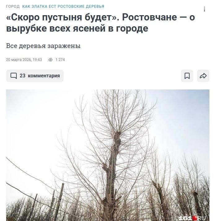 ? 🌳🫡«Скоро пустыня будет». Ростовчане — о вырубке всех ясеней в городе. Все 433 гектара ясеней в городских лесах Ростова якобы заражены изумрудной златкой. Спасти их невозможно — деревья уже начали вырубать. Город может почти полностью потерять Соловьиную рощу. Там ясени занимают 87% от всех деревьев, и при выделении финансирования их вырубят. Власти обещают компенсационные высадки, но как скоро они начнутся, неизвестно. Новости о вырубке ясеней вызвали бурную реакцию у ростовчан. Они переживают, что теперь будут задыхаться от жары и пыльных бурь. Некоторые обратили внимание, что другим породам деревьев тоже не очень хорошо: дубы и сосны болеют и погибают. Прекрасно. И так полгорода выпилили, а что не выпилили — сделали пеньками. Раскаленный город будет еще жарче Мы летом задыхаемся от жары, пыли и пылевых бурь. Деревьев с каждым годом всё меньше. Скоро пустыня будет. Это вредительство какое-то А что с соснами происходит? Уже не один год гибнут, и никто их даже не вырезает. В