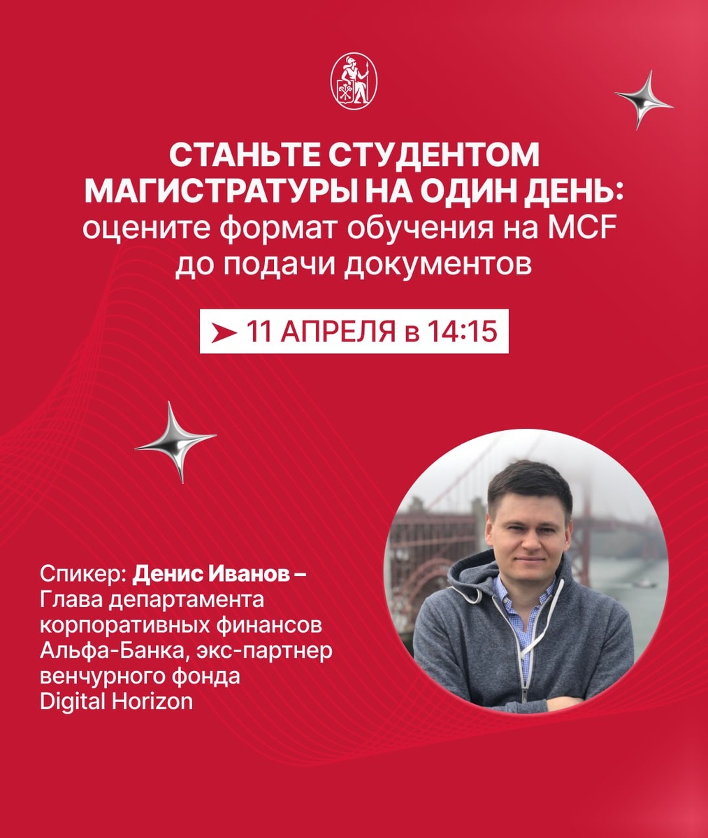курсу Advanced Corporate Finance вместе со студентами MCF первого года обучения. Это возможность: 🔸 Погрузиться в интересные теоретические и практические аспекты корпоративных финансов 🔸 Познакомиться с форматом работы преподавателей-практиков на MCF 🔸 Оценить свой уровень английского языка перед поступлением Особенность программы MCF: 80% учебных часов на программе ведут эксперты из бизнеса: Банк ВТБ, ТеДо, Кэпт, Банк России, Атон, Сбер, Норникель, Уралсиб, Газпромбанк и другие. Узнайте, как это помогает выпускникам находить офферы мечты ещё до получения диплома. Данное открытое занятие – яркий пример такого подхода: лекцию ведет действующий практик. 💬 Спикер: Денис Иванов – Глава департамента корпоративных финансов Альфа-Банка, экс-партнёр венчурного фонда Digital Horizon. С 2025 года принимает участие в подготовке и проведении занятий по курсу «Структурирование сделок» для студентов 2 курса программы MCF. Тема занятия: «Стратегические аспекты слияний и поглощений» В ходе
