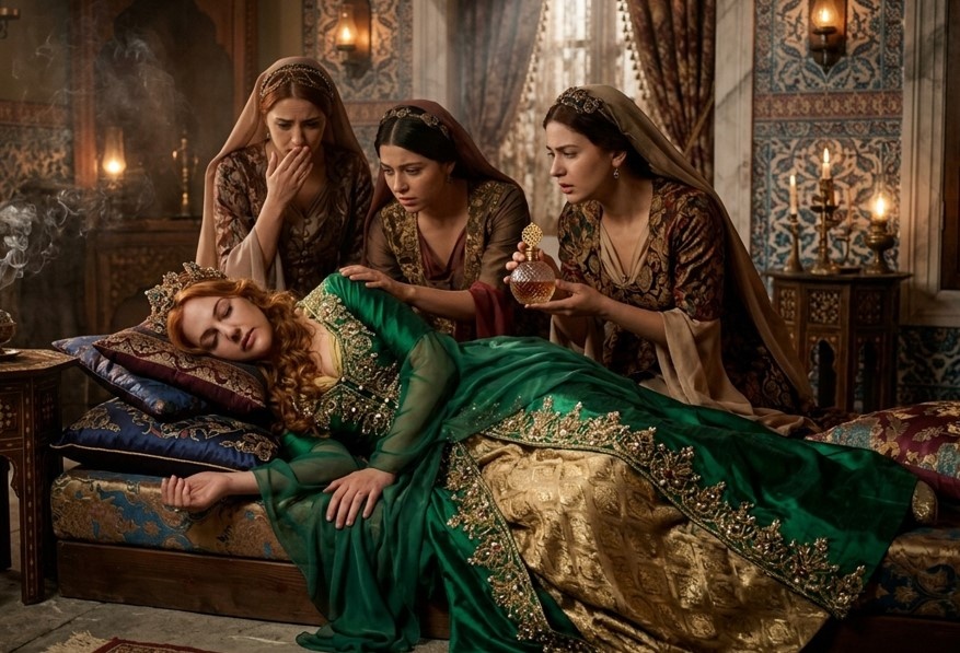 Хюррем не просто присвоила эти духи — она начала втирать их в кожу в больших количествах, буквально «измазалась вся» до такой степени, что от концентрированного аромата ей стало дурно.