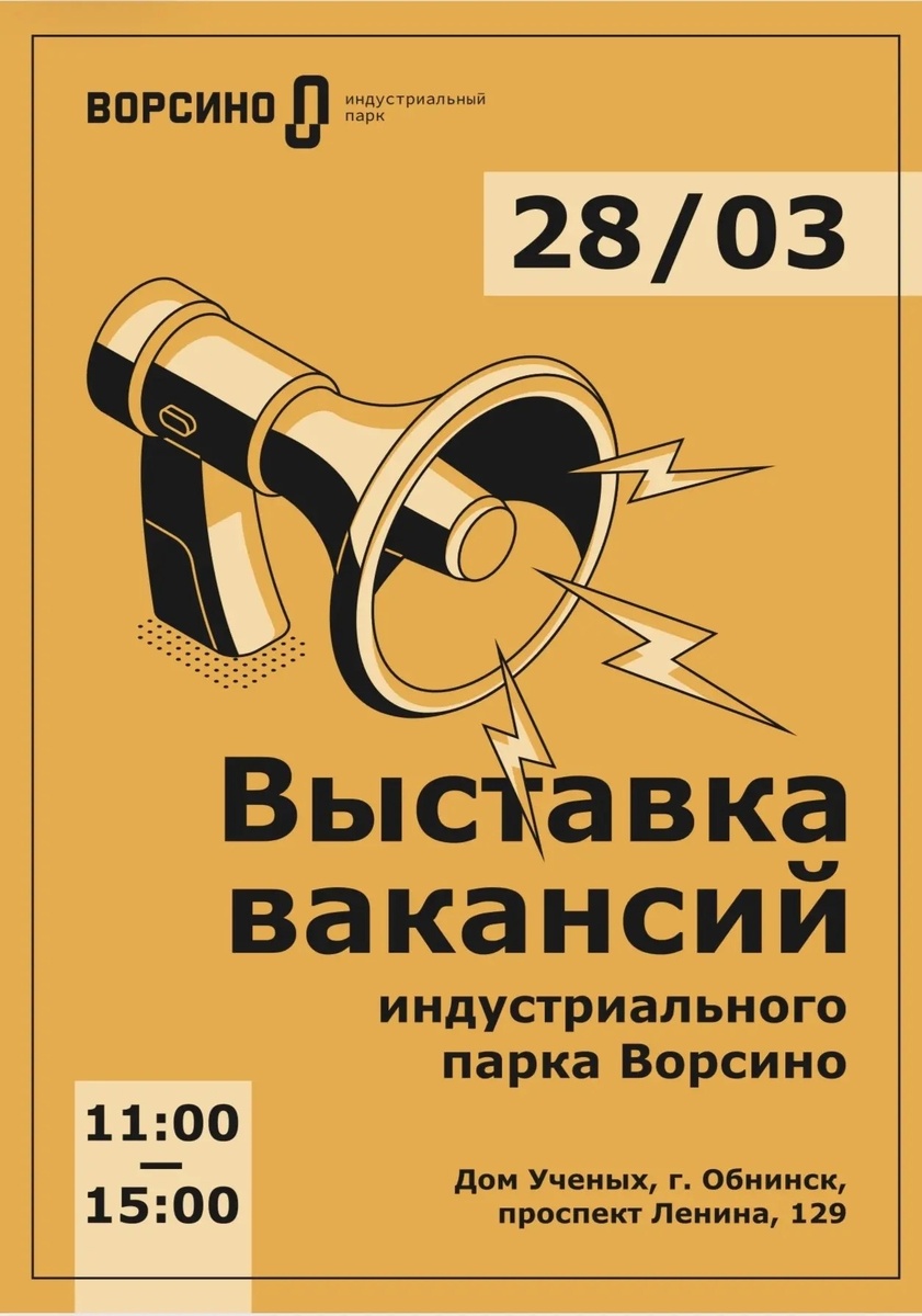 ⚡25 марта с 11:00 до 15:00 в Доме учёных в Обнинске пройдёт выставка вакансий, организованная Индустриальным парком «Ворсино