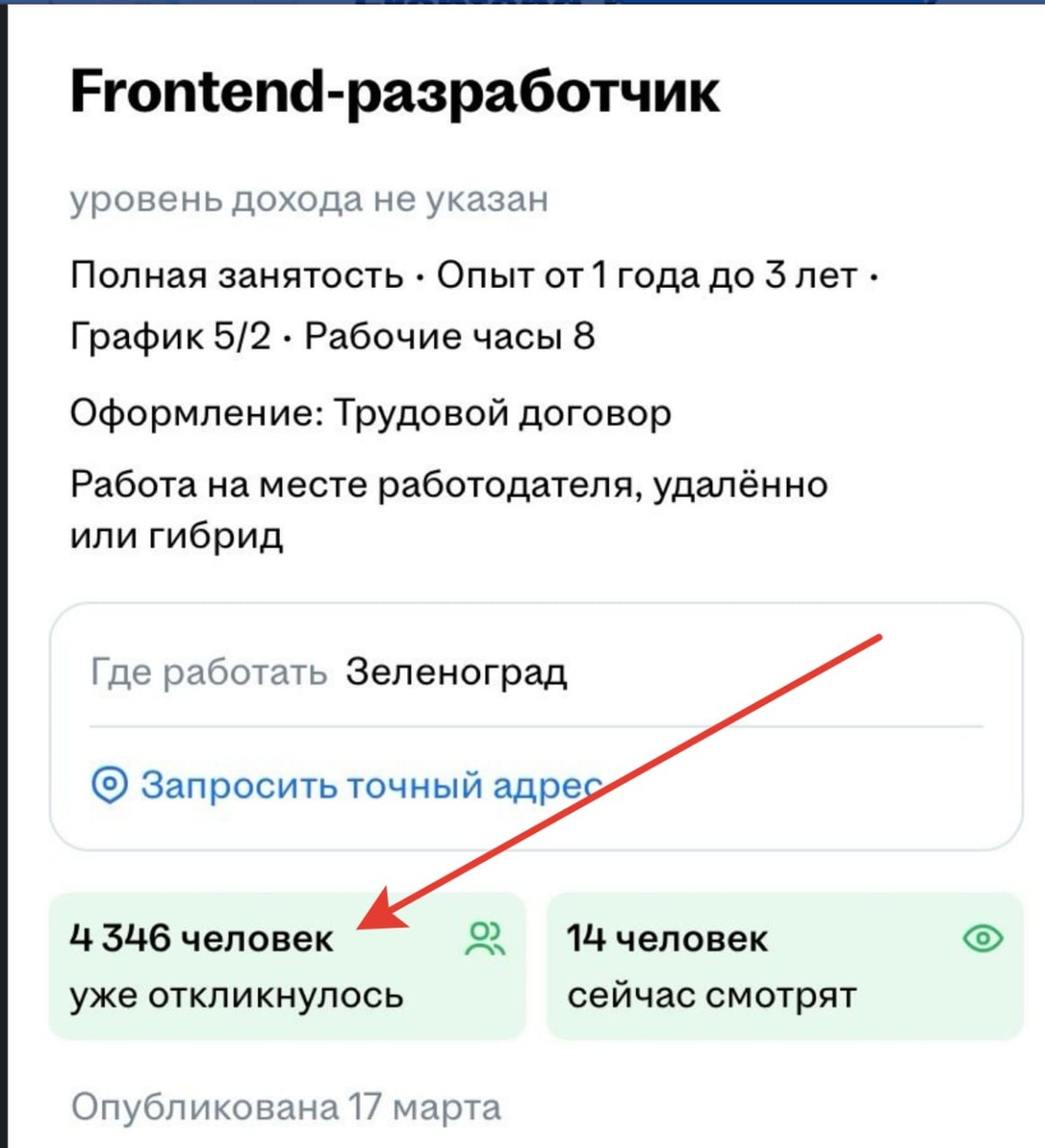 п. Ну тут удаленка, поэтому столько соискателей. А вообще бедные фронты - им сейчас тяжко, надо признать. А прикиньте всех попросят сделать тестовое :) Рехнуться. @clickfraud.ru