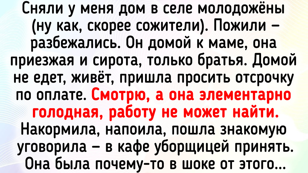Сняли у меня дом в селе молодожёны (ну как, скорее сожители). Пожили — разбежались. Он домой к маме, она приезжая и сирота, только братья. Домой не едет, живёт, пришла просить отсрочку по оплате. Смотрю, а она элементарно голодная, работу не найдёт. Накормила, напоила, пошла знакомую уговорила — в кафе уборщицей принять. Она была почему-то в шоке от этого. Спрашивает: «За что и почему я о ней так забочусь?..» Тут я сама в шоке стала. Если мы не будем друг другу помогать, то что мы за люди? © Я / Dzen У меня сотрудница 2 года назад подобрала стрижа — выпал из гнезда. Вырастила, выкормила, и он улетел. Держала она его на балконе — балкон застеклён, но неплотно. И вот буквально этим летом, спустя 2 года, рассказывает: «Сижу дома, слышу — кто-то стучит на балконе». Выхожу — стриж. А лето в этом году у нас было очень холодное, видать, есть ему нечего было, он и прилетел. В итоге пожил у неё неделю, она его опять кормила, а потом, как на улице потеплело, снова улетел. Стрижи и те добро помн