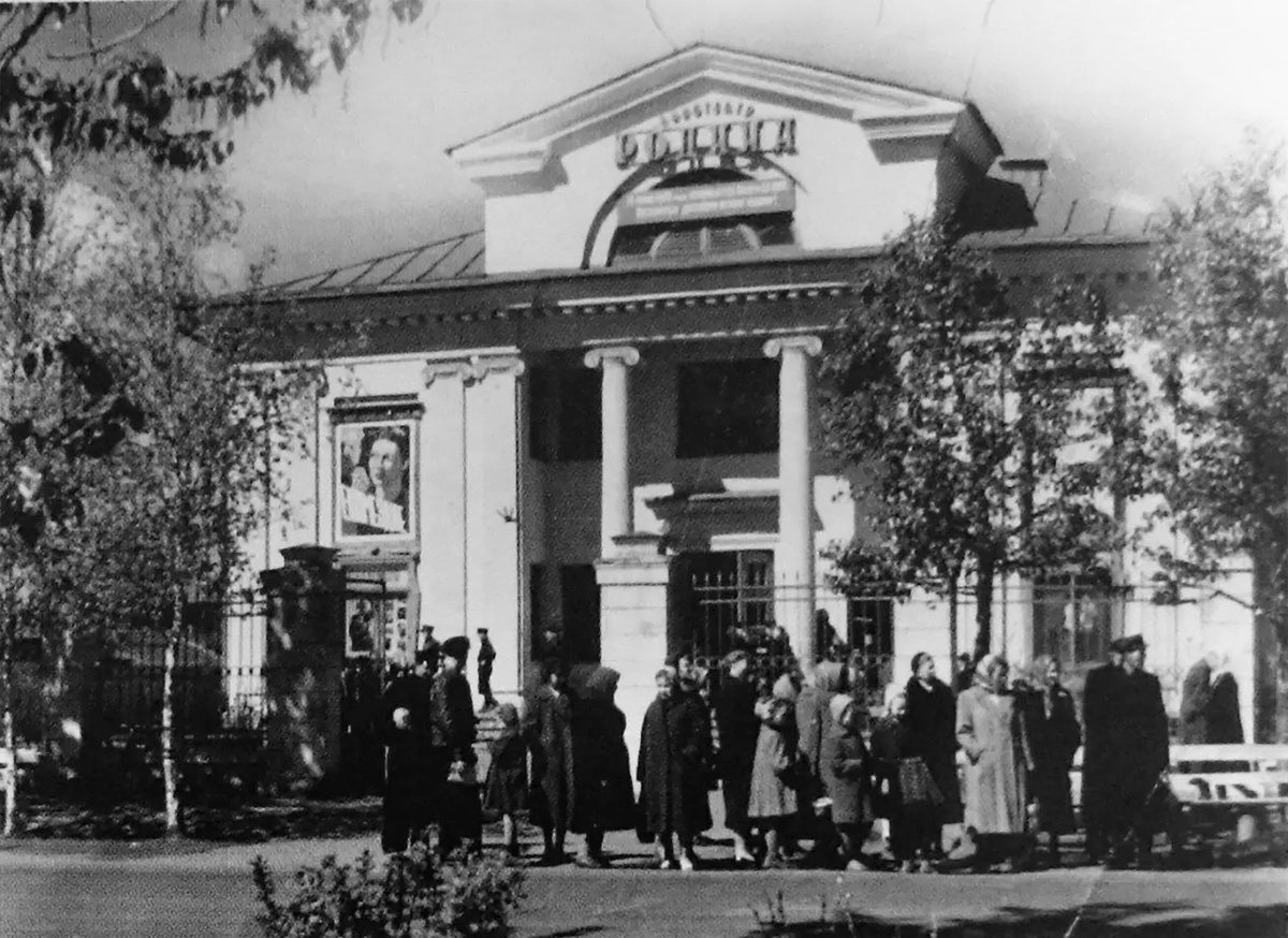 Ожидающие автобус на остановке у кинотеатра «Родина» на улице Чернышевского. Май 1960 года.