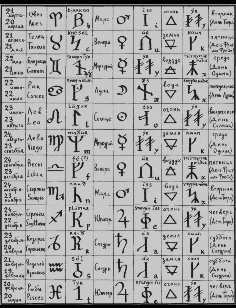 СООТВЕТСТВИЯ РУН ЗНАКАМ ЗОДИАКА, ПЛАНЕТАМ, ЭЛЕМЕНТАМ.
