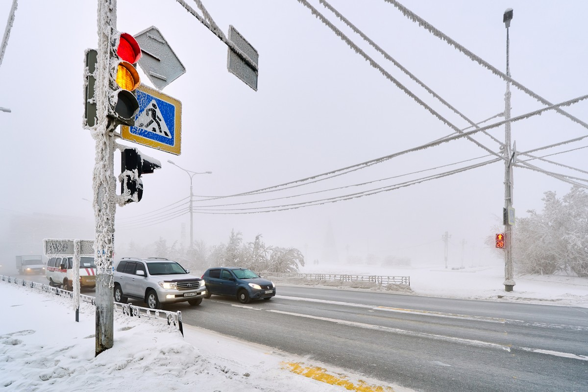 При запредельных морозах под -50°C и ниже мир становится другим. Его не просто вымораживает, он визуально перевоплощается, целиком укутываясь инеем - вообще всё обрастает толстым слоем белых пушистых кристаллов. Примерно как в морозильной камере, но только круче :) Белым инеем со всех сторон покрываются деревья, дорожные знаки, столбы, провода на столбах: