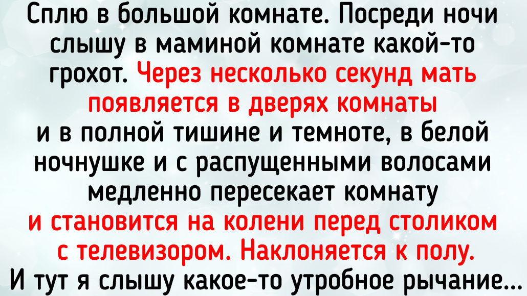 Сплю в большой комнате. Посреди ночи слышу в маминой комнате какой-то грохот. Через несколько секунд мать появляется в дверях комнаты и в полной тишине и темноте, в белой ночнушке и с распущенными волосами медленно пересекает комнату и становится на колени перед столиком с телевизором. Наклоняется к полу. И тут я слышу какое-то утробное рычание. Первая мысль: «Полнолуние ведь не скоро». Спрашиваю: «Мать, ты чего? Шабаш, что ли, начался?» Она оборачивается ко мне и говорит: «Ройка (кот) голубя поймал, вломился в окно и сейчас под телевизором сидит». © Вендиго Злой / Dzen