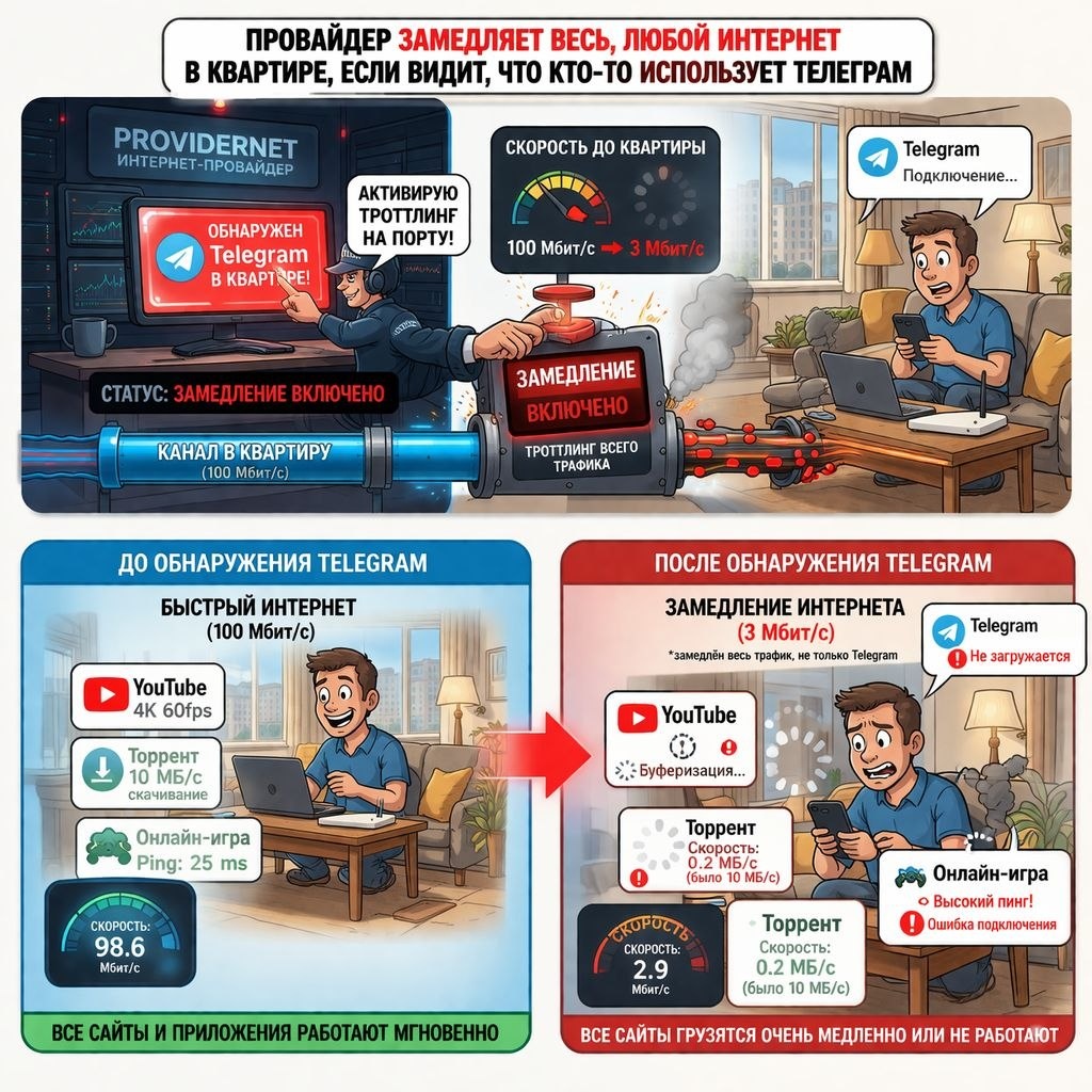 Но неприятная правда в том, что иногда это может быть не паранойя. 🥩 Провайдеры давно научились не просто «давать интернет», а смотреть, что именно внутри трафика происходит. Это называется DPI (Deep Packet Inspection) — грубо говоря, «рентген для ваших данных». И если система видит «что-то не то», она может: замедлить соединение, перекинуть в менее приоритетный канал, иногда даже «душить» отдельные сервисы. Похоже на очередь в поликлинике: формально все равны, но кого-то вдруг «просят подождать». Telegram — отдельная история. Он использует нестандартные протоколы, шифрование и частую смену адресов. Для фильтров это выглядит как аномалия, а не как «обычный YouTube или сайт». 🧠 Смотрите, какая штука. Тут работает эффект ложноположительного срабатывания — когда система принимает нормальное поведение за угрозу. По-простому: «перестраховались и прижали всех подряд». И вот парадокс: чем технологичнее сервис — тем чаще его подозревают. Потому что он хуже «читается» фильтрами. Не тебя