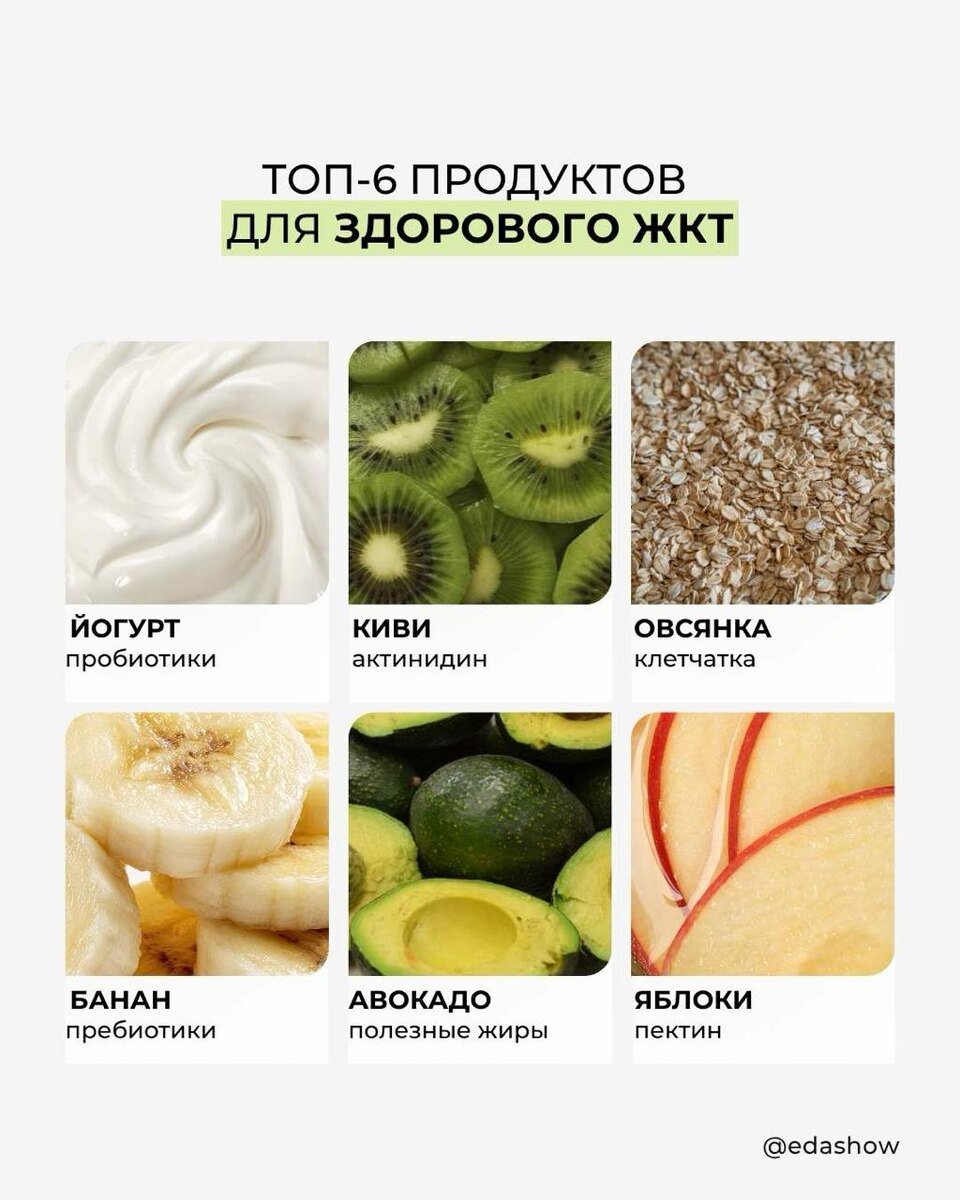Здоровый ЖКТ — это не только про комфорт, но и про иммунитет, кожу и уровень энергии. Иногда достаточно просто добавить в рацион правильные продукты, чтобы почувствовать разницу. Вот топ-6 продуктов для поддержки пищеварения: 🥛 Йогурт содержит пробиотики — полезные бактерии, которые поддерживают баланс микрофлоры кишечника и улучшают пищеварение. 🥝 Киви содержит фермент актинидин, который помогает переваривать белок и облегчает работу ЖКТ. 🥣 Овсянка богата растворимой клетчаткой, которая мягко очищает кишечник и служит питанием для полезных бактерий. 🍌 Банан содержит пребиотики, которые «кормят» хорошую микрофлору и поддерживают баланс кишечника. 🥑 Авокадо богато клетчаткой и полезными жирами. Поддерживает пищеварение и помогает усвоению питательных веществ. 🍎 Яблоко содержит пектин — растворимую клетчатку, которая поддерживает микрофлору и помогает мягко очищать кишечник. Регулярное добавление этих продуктов в рацион помогает наладить пищеварение и поддерживать здоровье кишечник