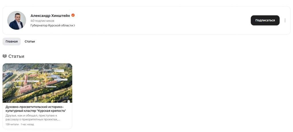 У главы Курской области появилась еще одна информационная площадка. Сегодня Александр Хинштейн сообщил жителям, что завел канал на платформе Дзен. Свою первую публикацию губернатор посвятил планам развития Курска. Он рассказал о создании духовно-просветительского историко-культурного кластера «Курская крепость», в котором планируют разместить 10 местных и федеральных музеев. Аудитория нового ресурса только начинает формироваться — пока на него подписан 41 человек.