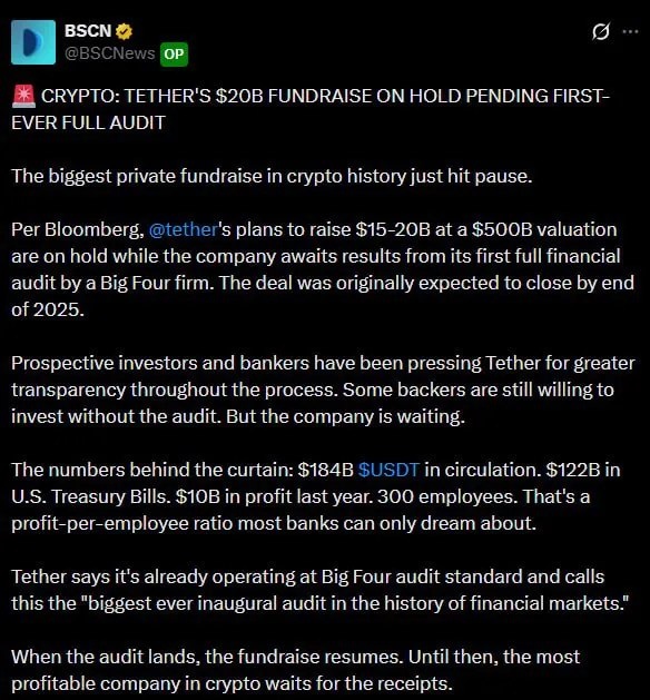 Компания Tether приостановила переговоры о привлечении $20 млрд после требований инвесторов и банкиров о повышении прозрачности. Первый полноценный аудит от «большой четвёрки» может закрыть или подтвердить многолетние подозрения в непрозрачности USDT. Среди ключевых решений и фактов: Компания Tether приостановила переговоры о привлечении $20 млрд после требований инвесторов и банкиров о повышении прозрачности; Первый полноценный финансовый аудит, проводимый одной из фирм «большой четвёрки», стал обязательным условием для возобновления сделки; Ранее Tether критиковали за непрозрачность, что провоцировало слухи и недоверие к стабильности USDT; Результаты аудита… Читать полностью