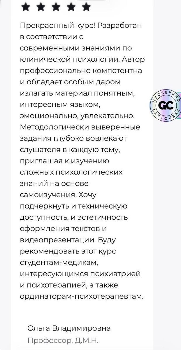 ? Задумываетесь о том что пора саморазвиваться, возможно психология - ваш путь? Для всех кто хочет разобраться в возможностях и направлениях психотерапии, научиться отделять инфоцыганство от научного подхода, выбрать своего психотерапевта - этот курс для вас. Психотерапия без магии: как найти свой метод и получить результат? Бесплатный видеокурс из 19 уроков от клинического психолога Софьи Кремлёвой. Узнайте, как работают доказательные методы психотерапии (EMDR, КПТ, IFS) и выберите путь, который подходит именно вам. И что особенно ценно для меня - это рецензия на курс от доктора медицинских наук, профессора с полувековым стажем в области психотерапии. Все уроки открытые и бесплатные, это мой вклад в ваше психическое здоровье. Смотреть уроки