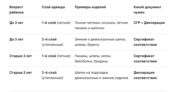 Таблица: какие документы нужны для детских головных уборов в 2026 году