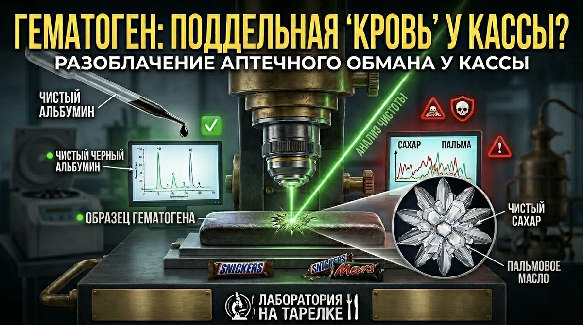 Настоящий гематоген по старому ГОСТу — это серьезный лечебный препарат. Его главным компонентом был черный пищевой альбумин (высушенная очищенная бычья кровь), который идеально усваивался организмом. Но пищевые корпорации давно поняли: лить настоящую кровь — сложно, дорого и невкусно. Гораздо выгоднее завалить полки сладкими суррогатами. Мы в «Лаборатории на тарелке» разобрали состав популярных плиток и выяснили, кто продает нам лечебный белок, а кто — подкрашенный сахар по цене золота.