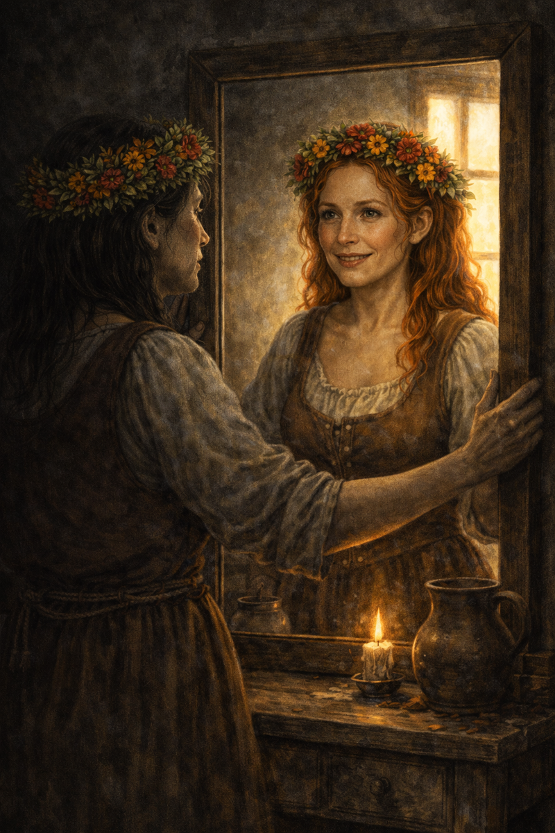 Венок сидел идеально. Трава свежая, цветы как будто только что сорваны, ни один лепесток не примят, не пожух, не потемнел. Он будто не на голову был надет, а вырос там, где ему положено. Дарья провела пальцами по волосам, осторожно, почти с благоговением.