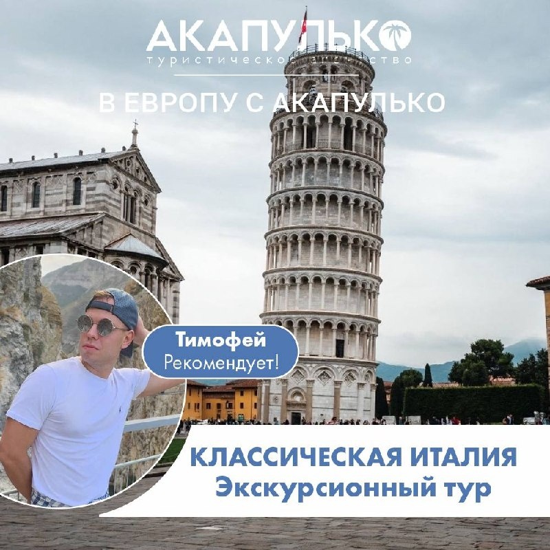 🇮🇹🍝🍕📖📖📖📖📖📖 ✈вылет из Москвы до Рима ( с удобной стыковкой в Стамбуле) 7 сентября на 7 ночей Экскурсионный тур "Классическая Италия" 🔖Какие локации посещаем: Рим, Ватикан, Монтекатини-Терме, Пиза, Флоренция, Венето, Венеция. 🏛️Включены обзорные экскурсии: 🔴Рим- экскурсия по Риму позволит увидеть основные достопримечательности Вечного города и узнать его увлекательную историю 🔴Флоренция - один из самых прекрасных городов в мире, именуемый также «городом искусств» 🔴Венеция - Знакомство с загадочной и романтичной Венецией ✅В стоимость входят: Авиабилеты с багажом до 30 кг, проживание в отелях 4* с завтраками, трансферы по программе, мед.страховка, страховка от невыезда, Виза в Италию, страховка визовый риск, обзорные экскурсии. ⭐️195 400 на человека при 2х местном размещении Хочешь отправиться в долгожданное путешествие по Италии? Ставь + в комментариях или пиши @Tima_Acapulco #В_Европу_с_Акапулько 📞Звоните: +79124829034 ☕Приезжайте: Пермь, ул.Советская, 54, офис 2