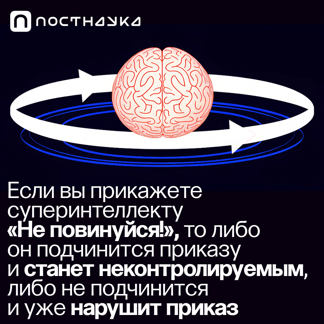 Это логический парадокс, который невозможно разрешить через программирование. Если суперинтеллект значительно превосходит человеческий, он может найти лазейки в любой системе ограничений, которые люди способны спроектировать. Как учёные, корпорации и фонды изучают риски искусственного интеллекта — обсуждаем с компьютер-сайентистом Романом Ямпольским: https://vkvideo.ru/video-36507793_456244230 Слушать на других платформах: https://hipolink.net/postnauka