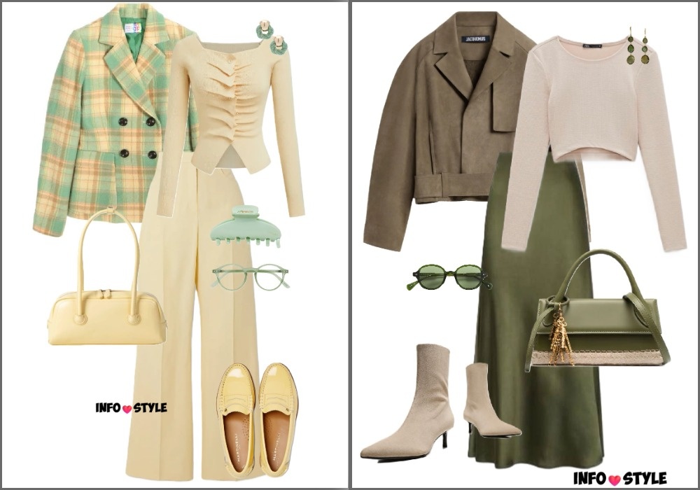 Стилизация в едином цвете визуально вытягивает силуэт и добавляет образу статусность. Стилисты рекомендуют собирать комплекты из оттенка "прохладная матча", наслаивая разные по плотности ткани, а плавный переход от светлого верха к более тёмному низу в рамках одной гаммы создает элегантный и свежий образ.