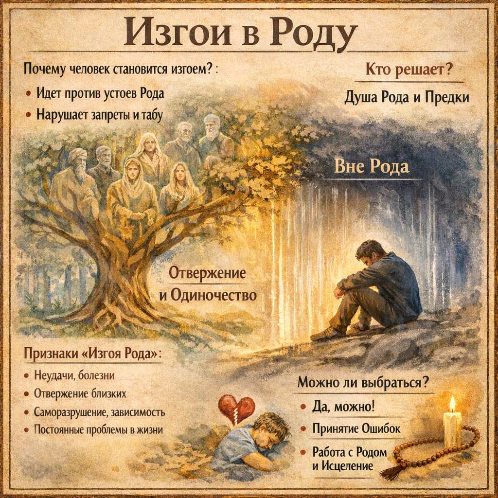 Есть и другой вариант - если человек своим поведением, мировоззрением или выбором начинает угрожать целостности рода или его традициям, система может просто «вытолкнуть» его. К примеру, когда кто-то из семьи решает уйти в монастырь, сменить веру или вступить в брак с человеком, неугодным роду. «Род не отказывается от родичей, если они бесплодны, это не предательство. Тупиковая ветвь делается только осознанно, и это уже является поводом для исключения из Рода». То есть изгоем становится тот, кто, с точки зрения родовой системы, добровольно отказывается от своего предназначения — продолжать род, чтить предков или следовать родовым устоям. При чем как в хорошем плане, так и в плохом. В плохом - это когда член рода не хочет жить так, как жили предки, он хочет жить своей жизнью.