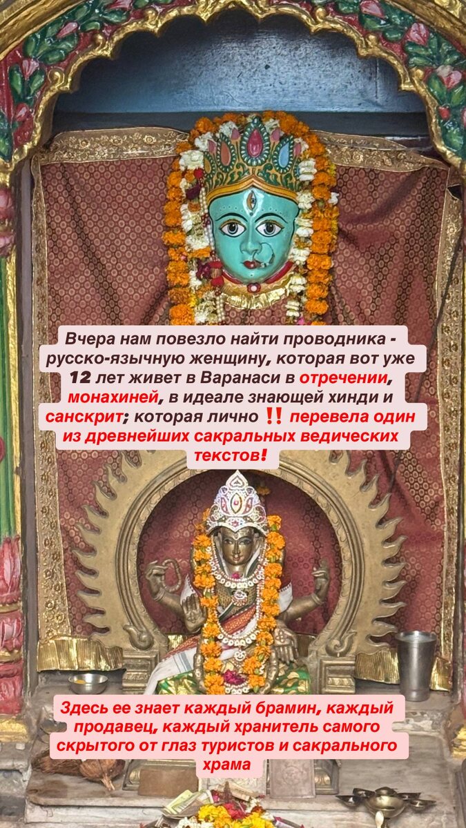 … Вчера нам повезло найти проводника - русско-язычную женщину, которая вот уже 12 лет живет в Варанаси в отречении, монахиней, в идеале знающей хинди и санскрит; которая лично ‼️ перевела один из древнейших сакральных ведических текстов! Здесь ее знает каждый брамин, каждый продавец, каждый хранитель самого скрытого от глаз туристов и сакрального храма. ➖➖➖➖➖➖➖➖➖➖➖ В ЗОЛОТОМ ХРАМЕ, в котором строго запрещено фотографировать, Брамин привязывает на запястье освященные нити, вчитывая в каждый узел секретную мантру. Женщинам всегда привязывают на левую руку. На меня он посмотрел…и повязал на правую, сказав что… …что в прошлой жизни я давала обед отречения от материальной жизни и супружества - и повязал на правую - как женщинам Саньяси - отрекшимся от мира, отшельницам. Именно это мы и снимали в очень священном месте. И знаете что? Я знала про эту жизнь. *Дорогие, для вашего удобства я создала канал в MAX 🌸 Переходите по этой ➡️ ссылочке и подписывайтесь, если у вас есть проблемы