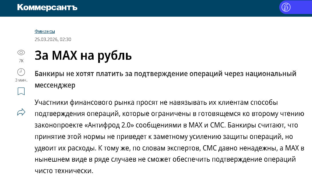 Следите внимательно на руками наперсточника. Сегодняшний Коммерсант. За МАХ на рубль Ко второму чтению в Госдуме подготовлен законопроект по которому ВСЕ способы подтверждения операций по онлайн-оплате будут ограничены ТОЛЬКО обязательными сообщениями в МАХ и СМС. Точка! Банкиры против. Соответствующее письмо Национальный совет финансового рынка (НСФР) направил в ЦБ и правительство Двойное подтверждение банкиры называют «юридически избыточной и необоснованно затратной» процедурой. Увеличит вдвое их расходы операторам связи. Если у банкиров не будет выбора о способах извещения клиентов, это может создать крупные тем неприятности: «Любой серьезный технический сбой или компьютерный инцидент, например DDoS-атака на национальный мессенджер, может привести к остановке на неопределенное время всей юридически значимой онлайн-деятельности в стране, включая банковские операции и совершение сделок». В пресс-службе мессенджера MAX отказались от комментариев. Ну еще бы. Следующий шаг вижу так. Чере
