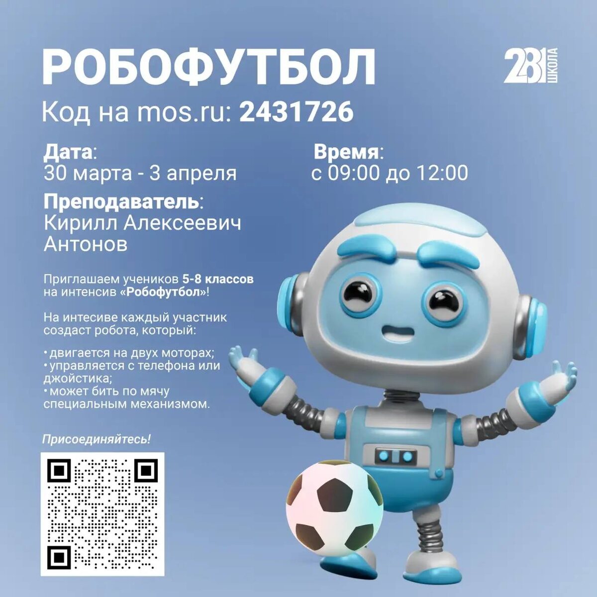 🚀 Приглашаем учеников 5-8 классов провести каникулы с пользой на интенсиве «Робофутбол»! ⚽️ 📆 Дата проведения: 30 марта—3 апреля ⏰ Время проведения: с 09:00 до 12:00 📍 Адрес: ул. Коминтерна, д.4, к.1 🔑 Код для записи на mos.ru: 2431726 🗓 Программа интенсива: 📅 День 1: робофутбол: введение в дисциплину, разработка концепции. 💻 День 2: робофутбол: сборка в виртуальной среде, разработка корпуса. 🛠 День 3: робофутбол: сборка робофутболиста. ⚙️ День 4: робофутбол: тестирование на полях. 🏆 День 5: робофутбол: робо-турнир. На интенсиве участники: ✅ Познакомятся с основами робототехники ✅ Разберутся, как устроены мобильные роботы ✅ Соберут собственного робота на базе ESP32 ✅ Подключат моторы через драйвер управления ✅ Настроят управление роботом с телефона или джойстика ✅ Создадут механизм удара по мячу с помощью сервопривода 🔥 Фишки интенсива: 🔹 Настоящая робототехника и программирование 🔹 Управление роботом по беспроводной связи 🔹 Механизм «кикера» для удара по мячу 🔹 Ком