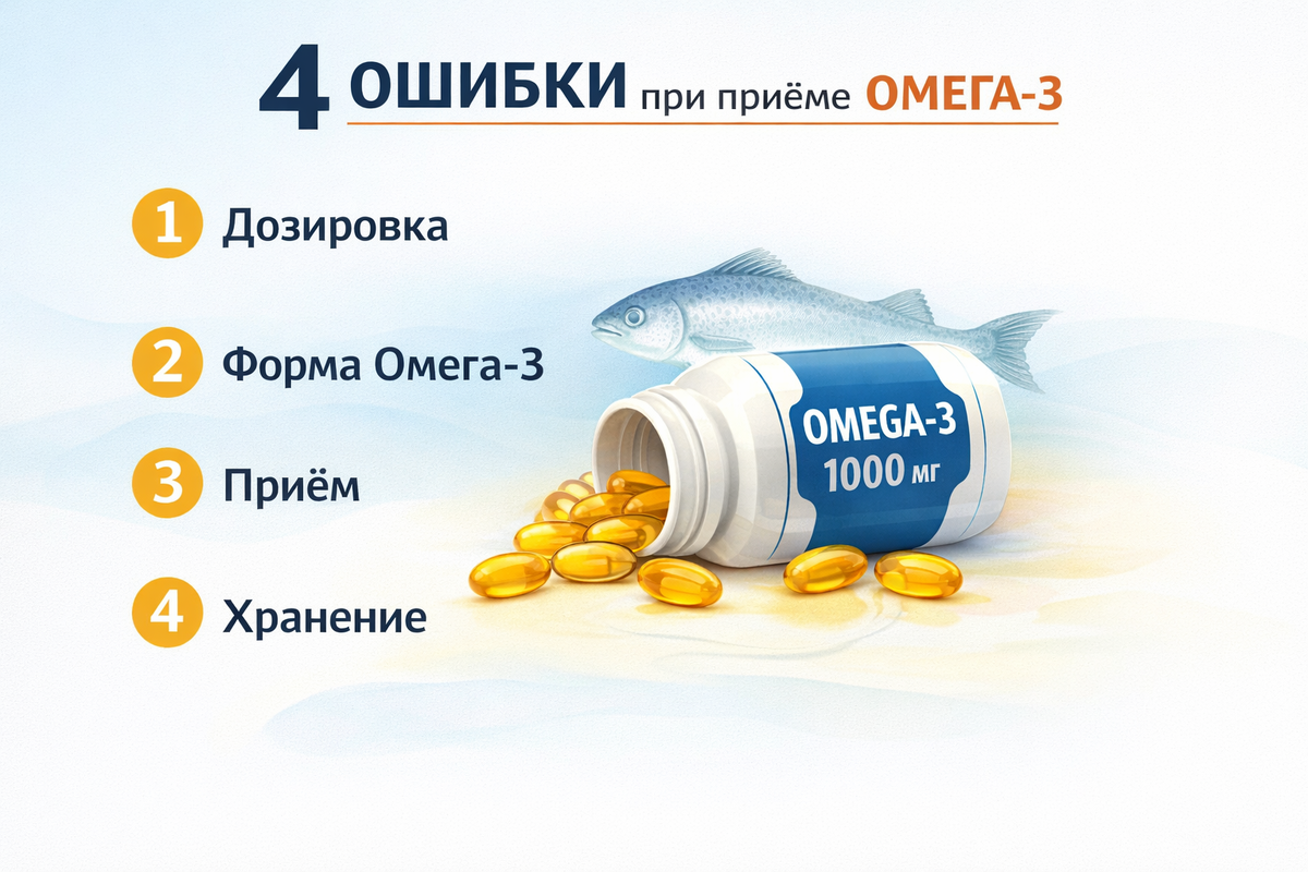 4 ошибки при выборе и приёме омега-3, из-за которых добавка может оказаться пустой тратой денег Те, кто редко ест рыбу, часто недополучают омега-3 с едой. Поэтому многие покупают добавки, но далеко не всегда получают от них ту пользу, на которую рассчитывают. Вот на что важно смотреть. Ошибка 1. Смотреть на крупную цифру “1000 мг”, а не на EPA + DHA На банке может быть красиво написано “1000 мг”, но это часто вес всей капсулы с маслом, а не количество активных омега-3. Как правильно: смотрите именно на сумму EPA + DHA в дневной дозе. Если там всего 250–300 мг, это очень слабый вариант. Для ощутимой пользы лучше выбирать добавку, где EPA + DHA в сумме дают около 1000 мг в день. Ошибка 2. Не обращать внимания на форму омега-3 Не вся омега-3 одинаково хорошо усваивается. Как правильно: лучший базовый вариант — триглицеридная форма (TG). Это натуральная форма, как в рыбе, обычно она лучше усваивается и мягче для ЖКТ. Если нужна более высокая концентрация, можно смотреть на rTG — это