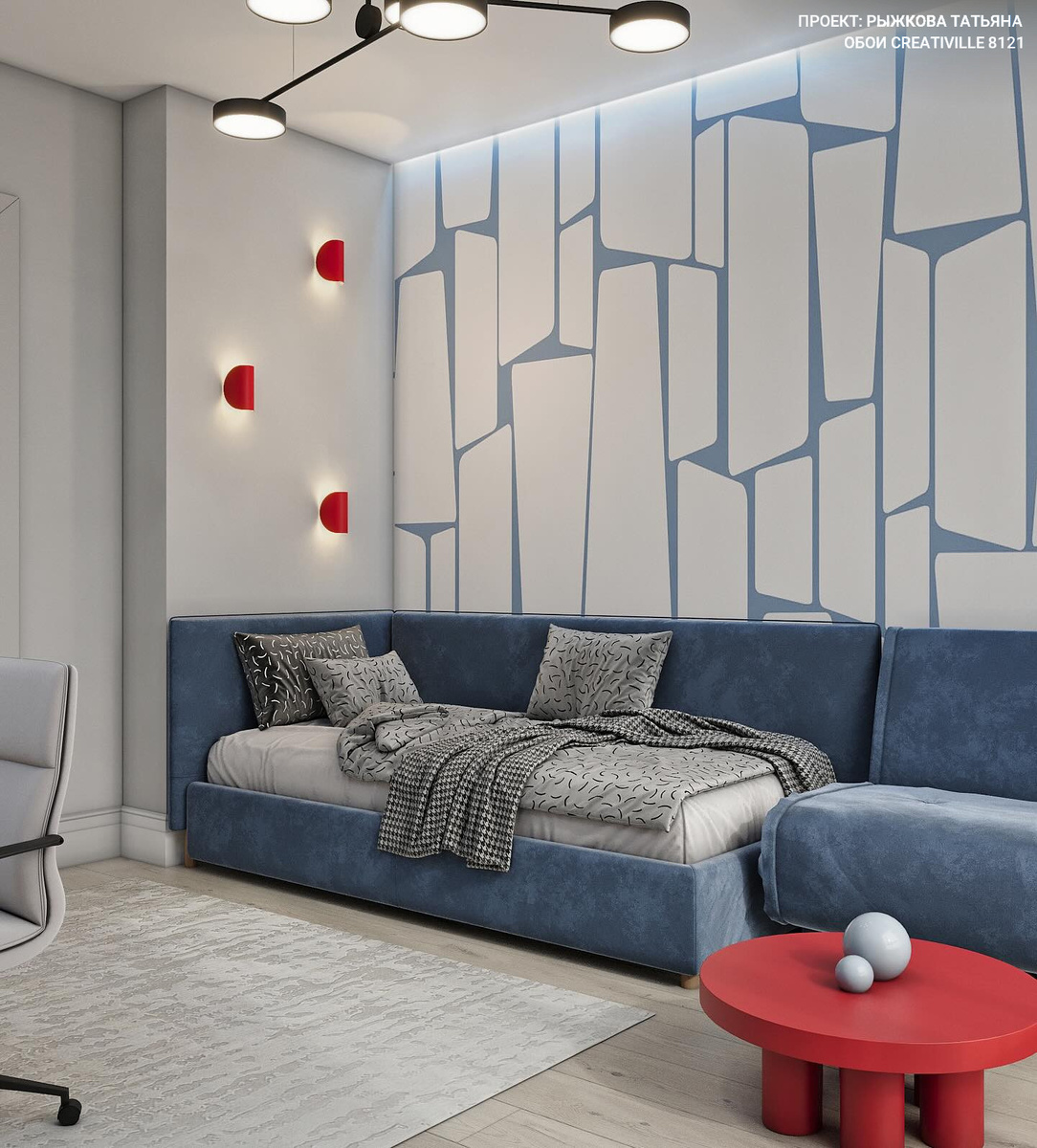 На этот раз поговорим про коллекцию Creativille 8121. На первый взляд, сюжет тут достаточно простой - прямоугольники и трапеции разных размеров с закругленными вершинами. Почему же она так популярна у дизайнеров и часто используется как трендовый акцент? Все цветовые варианты коллекции 8121 Нейтральные бежевые и серые цвета подойдут в спокойные интерьеры спальни или гостиной в стиле софт-минимализма, а также для детских в сочетании с яркими акцентами На этом проекте акцентные обои 8121 не только поддерживают зону отдыха и создают созвучие со шкафом, но и, переходя через внешний угол, визуально маскируют его Коллекция отлично заходит и во вполне взрослые солидные интерьеры. Особенно если найти ей в пару идеальную по форме мебель Их можно уже использовать как цветовой акцент, поэтому такие обои чаще выклеивают вставкой, зонируя и подчеркивая нужный участок стены. Крупная мебель, стоящая рядом, должна быть однотонной, а яркая деталь в виде светильника или столика такого же яркого оттенк