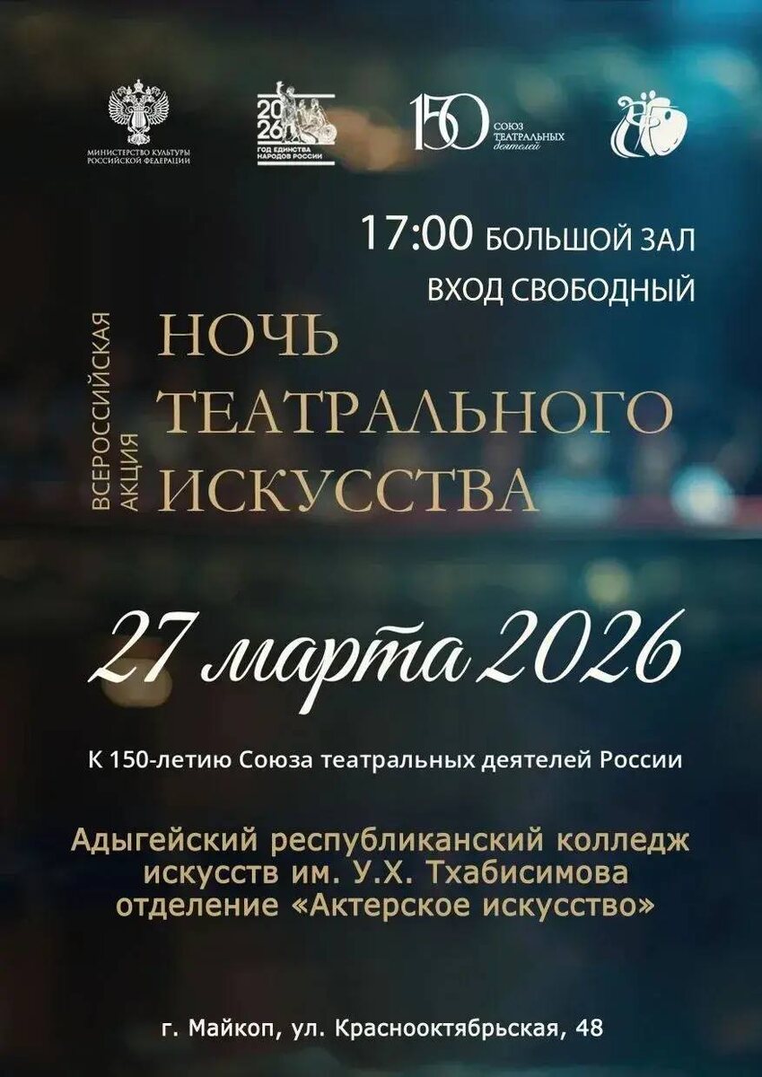 » Отделение «Актерское искусство» Адыгейского Республиканского колледжа искусств имени У.Тхабисимова представляет концертную программу «Театр сквозь века», посвященную 150 летию Союза театральных деятелей и Международному дню театра. В программе: ⭐️Отрывки из спектаклей — зрителей ждут фрагменты из произведений русской и зарубежной классики, а также современная драматургия. Будущие актеры продемонстрируют мастерство перевоплощения и силу ансамбля. ⭐️Хореографические номера — от изящного классического танца до дерзкой современной хореографии. Пластическое решение номеров станет отдельным украшением вечера. ⭐️Вокальные композиции — живые голоса студентов наполнят зал энергией и глубиной чувств. 💬Минкульт Адыгеи в МАХ #новости_минкульт_РА #НочьТеатральногоИскусства2026 #СТД