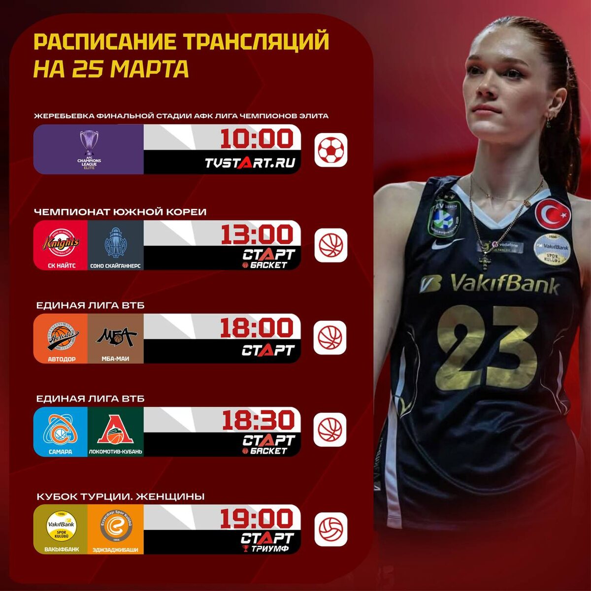 ! Утро начнем с жеребьевки АЛЧ, а продолжим — корейским баскетболом. На вечер же в планах Единая Лига ВТБ и финал турецкого Кубка по волейболу — болеем за Маркову! А еще — еврокубковые игры в мужской волейбольной ЛЧ. Смотрим с удовольствием 🤩 Подписывайся на ТВ СТАРТ в MAX📲
