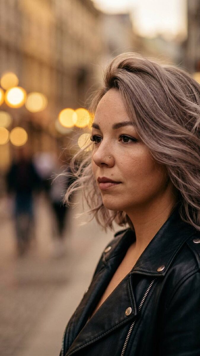 🌟Переходим на удобный сервис для генерации: Ссылка 👉 Syntx Ai Ссылка 👉 Veo3 📌ИНСТРУКЦИЯ ПО ИСПОЛЬЗОВАНИЮ В ЗАКРЕПЛЕННЫХ СООБЩЕНИЯХ 👍👍👍👍👍👍 ⚠️ПОДПИШИСЬ НА РЕЗЕРВНЫЕ КАНАЛЫ 👇 📱 канал в ВК 📱 канал в МАХ ◾️ПРОМПТ : Не меняй черты лица.. Портрет крупным планом девушки в чёрной кожаной куртке. Безупречный макияж, ровный тон кожи. Волосы цветом как на фото, короткие, но густые, с объемом у Корней, слегка развиваются на ветру. Она смотрит в сторону. На заднем плане — размытая уличная сцена с тёплым боке, что указывает на вечернюю обстановку. Снято на Canon EOS 5D Mark IV с объективом 50 мм f/1.2, ISO 800, 1/160 с, f/1.4. Изображение создаёт лёгкую кинематографическую атмосферу благодаря мягкому рассеянному освещению и насыщенным тёплым цветам, подчёркивающим её уверенный и стильный образ.