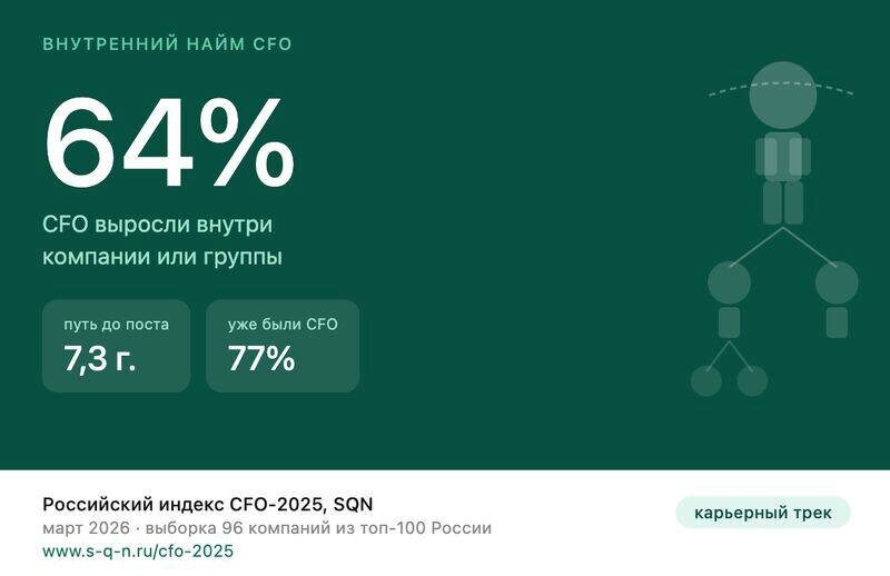 SQN). Средний путь "роста" внутри компании до поста CFO составляет 7,3 года. Это одна из тех цифр, которая одновременно успокаивает и тревожит. Зависит от того, с какой стороны смотреть. Хорошая новость: компании осознанно строят финансовых лидеров изнутри. Это значит, что если вы сейчас сильный руководитель финансовой функции в крупной компании и инвестируете в свою видимость и влияние, у вас реальные шансы на рост внутри. Неудобная новость: рынок стал значительно менее открытым для внешних кандидатов без опыта в роли CFO. 77% новых назначений это люди, которые уже занимали аналогичные позиции в других структурах. Компании следуют принципу "привлекать с рынка только готовые решения" и не готовы принимать избыточный риск, давая роль тому, у кого ее еще не было. Если вы хотите стать CFO впервые, то окно возможностей это либо внутренний рост в вашей компании, либо переход в компанию меньшего масштаба на полную роль. Именно так это работает на российском рынке прямо сейчас. Я сама в