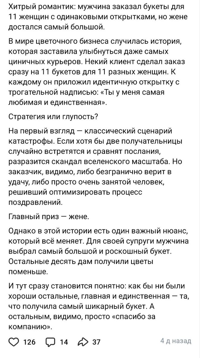 История тривиальная: на 8 марта мужчина заказал одинаковые букеты с одинаковыми открытками. Не знаю правда или нет, возможно число 11 преувеличено для красного словца. А может нет. Да и количество не столь важно