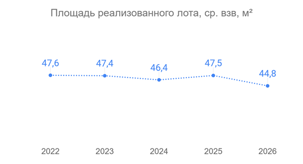 Средневзвешенная площадь проданных жилых помещений в начале 2026 года оказалась менее 45 кв. м, это минимальный показатель за всю историю строительной отрасли. Таковы данные аналитического центра «Движение.ру». Отрицательная динамика год к году фиксировалась в большинстве регионов России с крупными рынками первички. По данным Единой информационной системы жилищного строительства, средневзвешенная площадь реализованного по договорам долевого участия лота в новостройках в конце 2025 — начале 2026 г. составила 44,8 кв. м. При этом Рязанская область стала единственным регионом, где показатель в 2026 году превысил 50 кв. м. Однако в нашем регионе зафиксировано наиболее значительное сокращения показателя (-19,1%: 54,5 кв. м — конец 2025, 44 кв. м — начало 2026). Увеличение средневзвешенной площади произошло только в 3 регионах — Ленинградской, Московской и Тульской областях. «На конец 2025 года и начало 2026 года пришелся пик продаж жилья в новостройках, спрос был разогрет вступавшими в силу