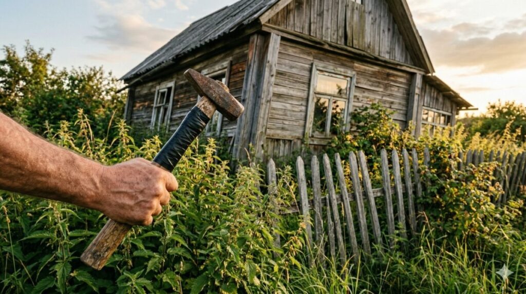 Забор — покосившийся, из серого штакетника, половина планок отсутствовала. Калитка открылась с третьей попытки — петли проржавели. Участок зарос по пояс — крапива, борщевик у дальнего угла. Яблоня, которая когда-то давала антоновку, стояла сухая.