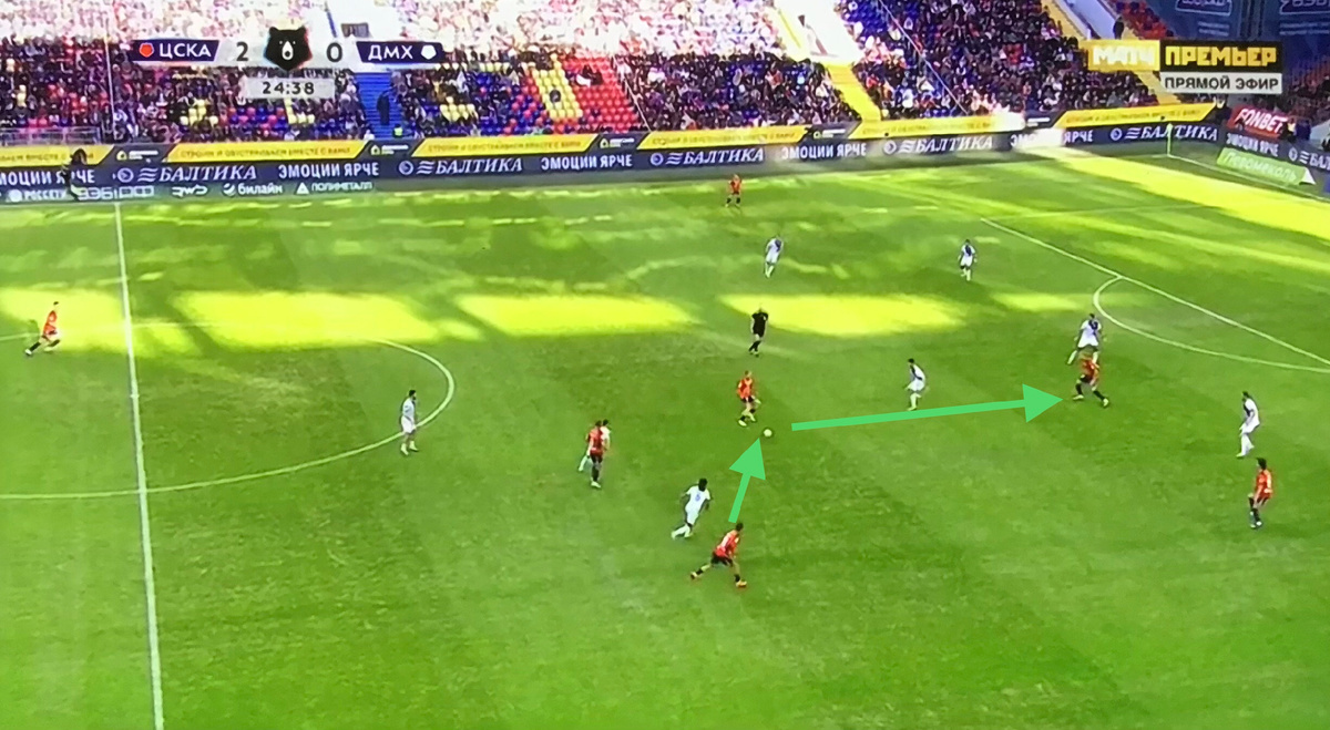 После мелкого фола на Облякове ЦСКА быстро вводит мяч. Кисляк в одно касание переводит его Гонду. Гонду делает первую в череде ошибок. Он также в касание отдаёт пас… сопернику. Гонду явно рассчитывал сыграть в стенку, но Кисляка заблокировал динамовец, что Гонду не учёл. Здесь нужно отдать должное махачкалинцам. В этом матче их шансом были в основном быстрые контратаки, и в данном случае они контратаку развернули стремительно. Мяч Агаларову от своей штрафной они доставили в три касания. Далее видны издержки высокой линии обороны, которую Челестини выстроил с самых своих первых матчей с ЦСКА еще летом прошлого года. В результате чего в данном матче Лукин остался фактически в центральном круге один на один с быстрым Агаларовым. И у Матвея всего два варианта - убегать за нападающим или попытаться сделать искус