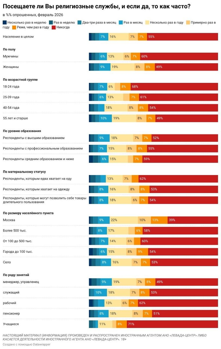 55% россиян сказали, что никогда не посещают религиозные службы. В XXI веке это рекордно высокая доля – с 22 по 25 год «никогда» на вопрос о частоте посещения религиозных служб отвечали 43-43%, и еще ни разу в этом веке доля не поднималась выше 47%. ✔️ Самая высокая доля «никогда» за время измерений была в 1991 году – 69%. ✔️ Раз в месяц и чаще посещают 15% (в том числе раз в неделю и чаще – 5%). ✔️ Мужчины отвечают «никогда» чаще женщин (60% против 49%). ✔️ Малоимущие россияне отвечают «никогда» чаще. ✔️ В Москве «никогда» отвечают намного реже, чем в остальной России (39%). ✔️ Чем моложе россияне, тем чаще они отвечают «никогда». Но при этом среди молодежи до 24 лет доля посещающих службы "раз в месяц и чаще" выше, чем среди более старших россиян (исключение – россияне старше 55 лет, там эта доля еще выше).
