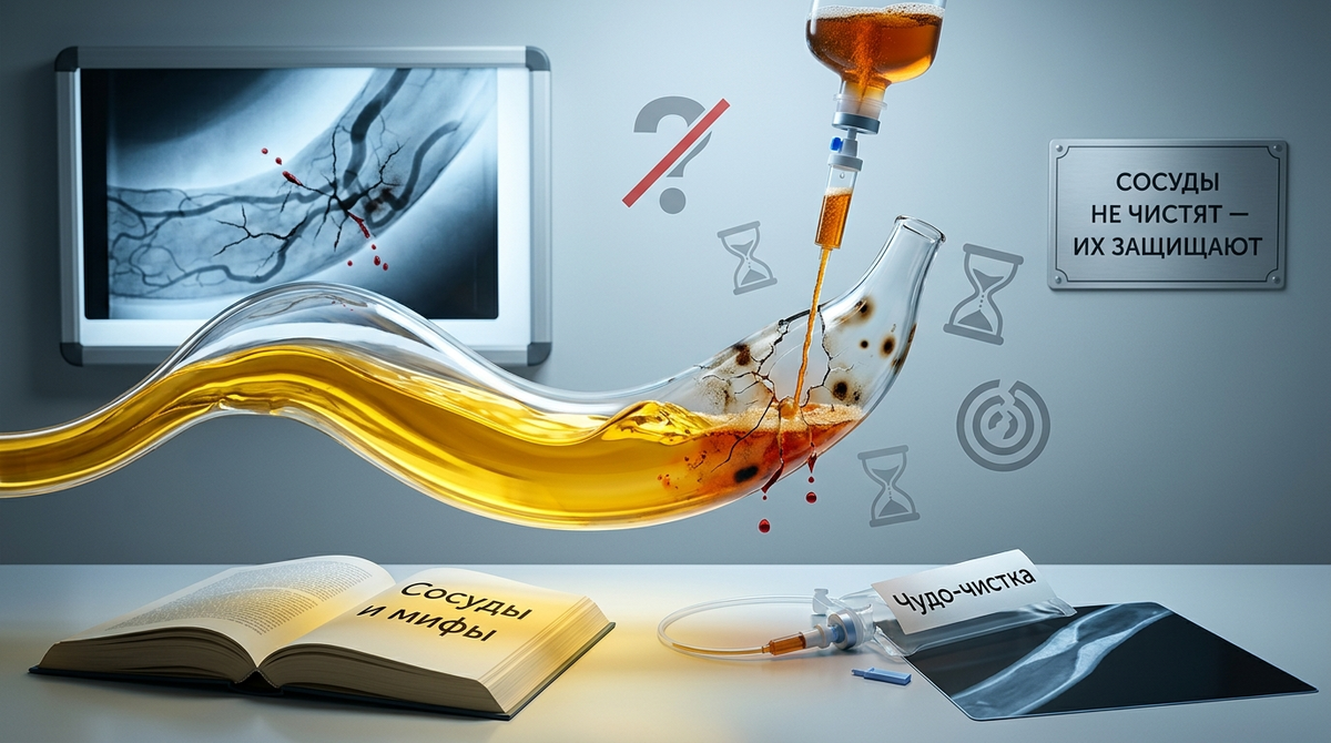 В интернете вовсю рекламируют «волшебные» капельницы, которые якобы смывают холестерин. Доктор Мясников предупреждает: сосуды – это не канализационные трубы. Попытка «почиститься» в домашних условиях часто заканчивается инсультом или реанимацией. Бляшки не лежат на поверхности стенки сосуда как грязь. Они прорастают внутрь ткани и становятся её частью. Представь, что ты пытаешься смыть из шланга накипь, которая въелась в саму резину. Это невозможно сделать потоком жидкости. Ни один препарат в мире не может «смыть» холестерин. Капельницы с витаминами или озоном могут лишь временно улучшить самочувствие. Но на размер бляшки они не влияют никак. Это просто способ выкачать из тебя деньги. Более того, резкое вмешательство в кровоток может быть опасно. Кусок бляшки может оторваться и улететь в мозг. Результат – мгновенный инсульт. Доверяй доказательной медицине, а не заманчивым обещаниям из рекламы. Почему мы так боимся холестерина? Потому что он делает сосуды узкими и жесткими. Сердцу стано