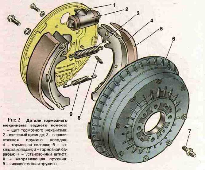 - Извлечение колодок: снимите переднюю колодку, затем распорную планку. Отсоедините наконечник троса ручника от рычага на задней колодке и снимите ее.