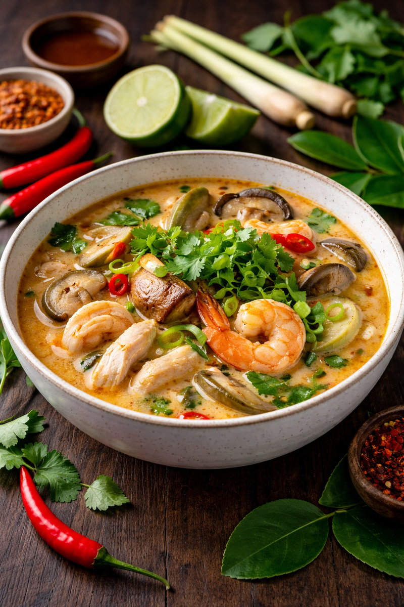 Секрет необычности — в сочетании кислого, острого и сладкого на фоне кремовой текстуры кокосового молока. Каждый компонент раскрывается постепенно: травы придают свежесть, имбирь и чеснок — пряность, морепродукты — насыщенный вкус. Этот суп не просто еда, это гастрономический опыт.