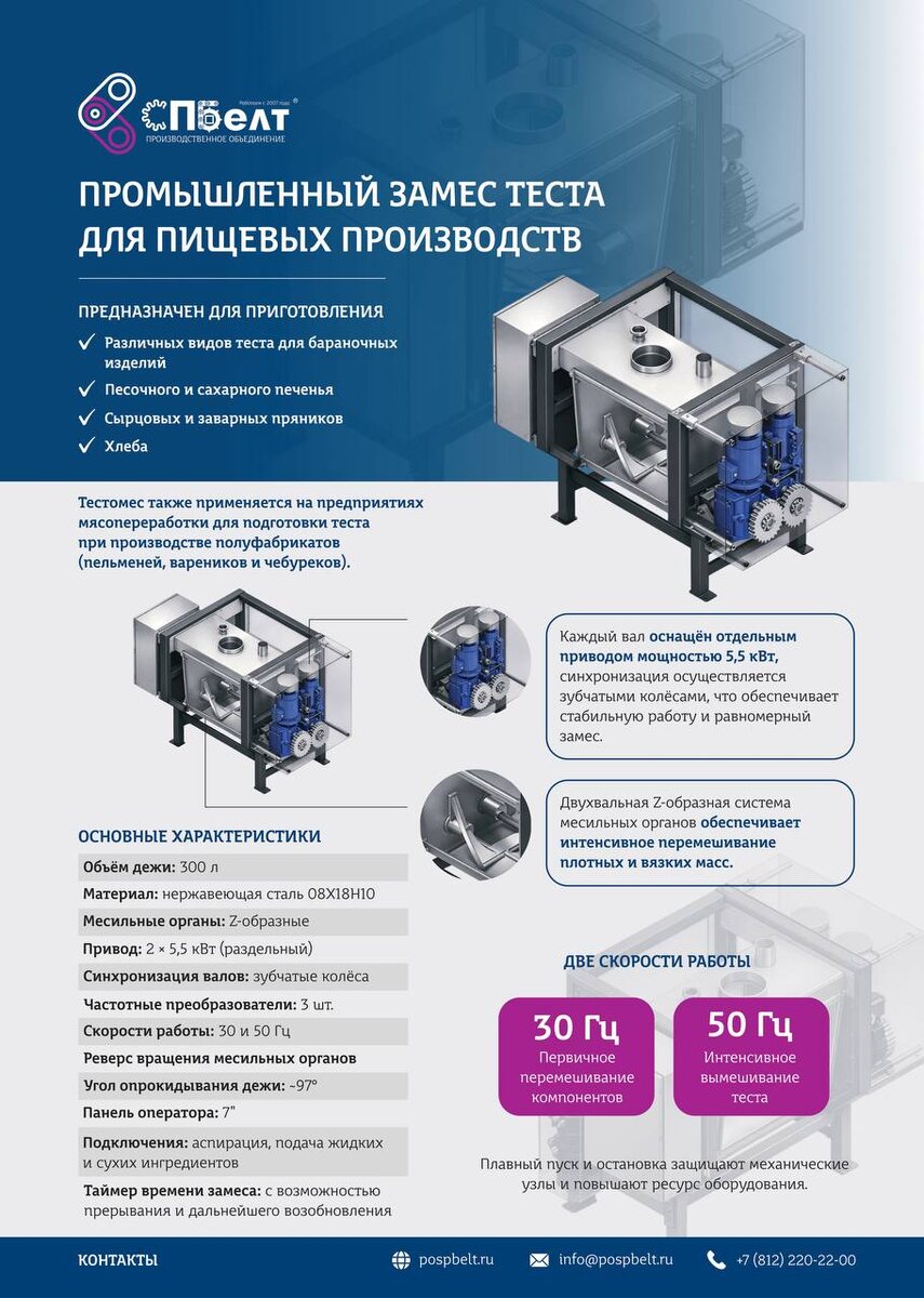 Там, где обычные решения дают нестабильную консистенцию, тестомес держит процесс под контролем. Оборудование рассчитано на работу с плотными и вязкими массами: — баранки и сушки — песочное и сахарное печенье — сырцовые и заварные пряники — хлеб — тесто для полуфабрикатов (пельмени, вареники и др.) Промышленный тестомес СПБелт это: • Двухвальная Z-образная система • Раздельные приводы валов по 5,5 кВт • Синхронизация через зубчатые колёса • Две скорости: 30 и 50 Гц • Объём дежи — 300 л • Реверс вращения • Опрокидывание дежи −97° Результат: — однородная структура теста — стабильное качество партии — снижение нагрузки на линию Если нужна замена нестабильного замеса на предсказуемый — это тот уровень оборудования. Посмотреть вживую 👇 📍 СПБелт на Modern Bakery Moscow 2026 📅 24–27 марта 2026 📍 Москва, Тимирязев Центр 📌 Стенд: Зал 1 «Чаянов», 1B90 Покажем в работе и подберём решение под ваше производство.