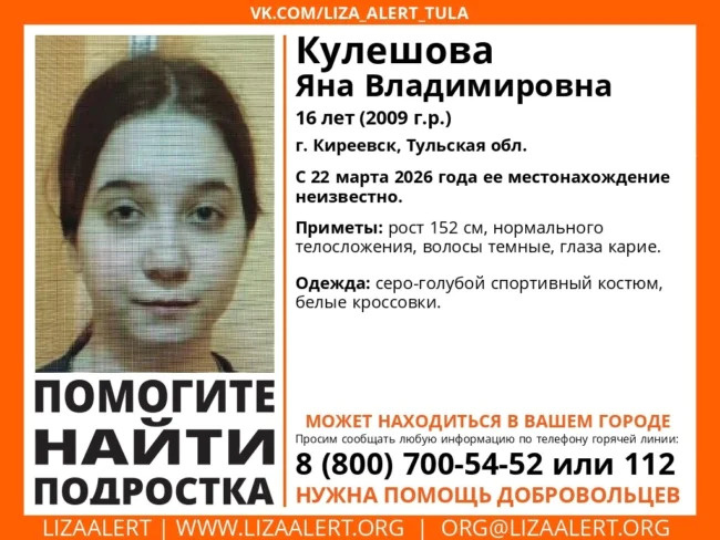 В Тульской области продолжают искать 16-летнюю Яну Кулешову, которая ушла из дома уже второй раз за неделю. Скорее всего, девочка находится в другом городе, об этом сообщает УМВД России по Тульской области. Полицейские рассказали, как проходили поиски Яны в первый раз. Сотрудники органов правопорядка остановили такси, в котором девочка-подросток ехала к друзьям. Благодаря слаженной работе сотрудников уголовного розыска и инспекторов ПДН местонахождение беглянки быстро установили. По нашей информации, девочка — воспитанница интерната. Никаких противоправных действий в отношении нее не совершалось, жизни и здоровью ничего не угрожает. Инспекторы выясняют, почему подросток решил сбежать из соцучреждения. Напомним, Яна пропадала уже дважды. Первый раз ее искали больше недели в Новомосковске, нашли 20 марта, но спустя два дня она снова ушла. По информации "Тульской прессы", девушка может находиться у молодого человека в другом городе.