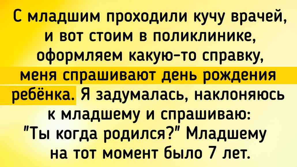 Наша учительница русского всегда ходила в блузке и вязаной жилетке поверх неё. И вот как-то по весне в классе стояла невыносимая духота, поэтому учительница под конец урока не выдержала и сняла жилетку. Правда, в тот день, как нарочно, она забыла надеть блузку... Ни до, ни после этого я ни разу не видела её, вылетевшей из класса с такой скоростью. © Анна Гуляева / Dzen Поехали с мужем за сушилкой для белья. Зима, вечер, темно, машина тёмная. Муж высадил меня у входа, а сам поехал перепарковаться, но я этого не знала. Выхожу с сушилкой и начинаю её старательно пихать на заднее сиденье в машину тёмного цвета, стоящую у входа, а параллельно ещё и устраиваю пропил мозга супругу на тему: "Что ты сидишь??? Не можешь выйти и помочь?". Когда подняла глаза, увидела за рулём офигевшего пожилого дядечку, который даже и не знал, как на это шоу реагировать. © Татьяна Павлецова / Dzen С младшим проходили кучу врачей, и вот стоим в поликлинике, оформляем какую-то справку, меня спрашивают день рожден