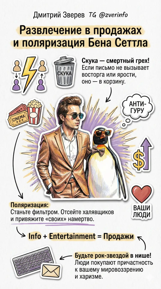 Продолжаю серию про приемы выдающихся инфомаркетологов и копирайтеров. Ранее говорили про Керна, Хэлберта, Чаперона. А теперь - Сеттл. Его стратегия строится на двух столпах: инфотейнменте (продажи с развлечением) и жесткой поляризации. Скука - это смертный грех маркетинга. Если ваше письмо не вызывает либо восторга, либо ярости, оно отправляется в корзину. Поляризация - это искусство быть «анти-гуру». Вы не пытаетесь понравиться всем. Напротив, вы осознанно транслируете резкие, порой непопулярные мнения. Это работает как фильтр: «халявщики» и нытики отсеиваются со скандалом, зато «ваши» люди привязываются к вам намертво, видя в вас живого человека, а не стерильный корпоративный справочник. Примеры инфотейнмента и поляризации: ➖ Тайм-менеджмент: «Магия ранних подъемов — это чушь для тех, кому нечем заняться. Я встаю в 11 утра и зарабатываю больше, чем "жаворонки" за неделю. Если вы верите, что успех зависит от будильника, вы обречены быть рабом системы». ➖ Изучение языков: «Перестаньте