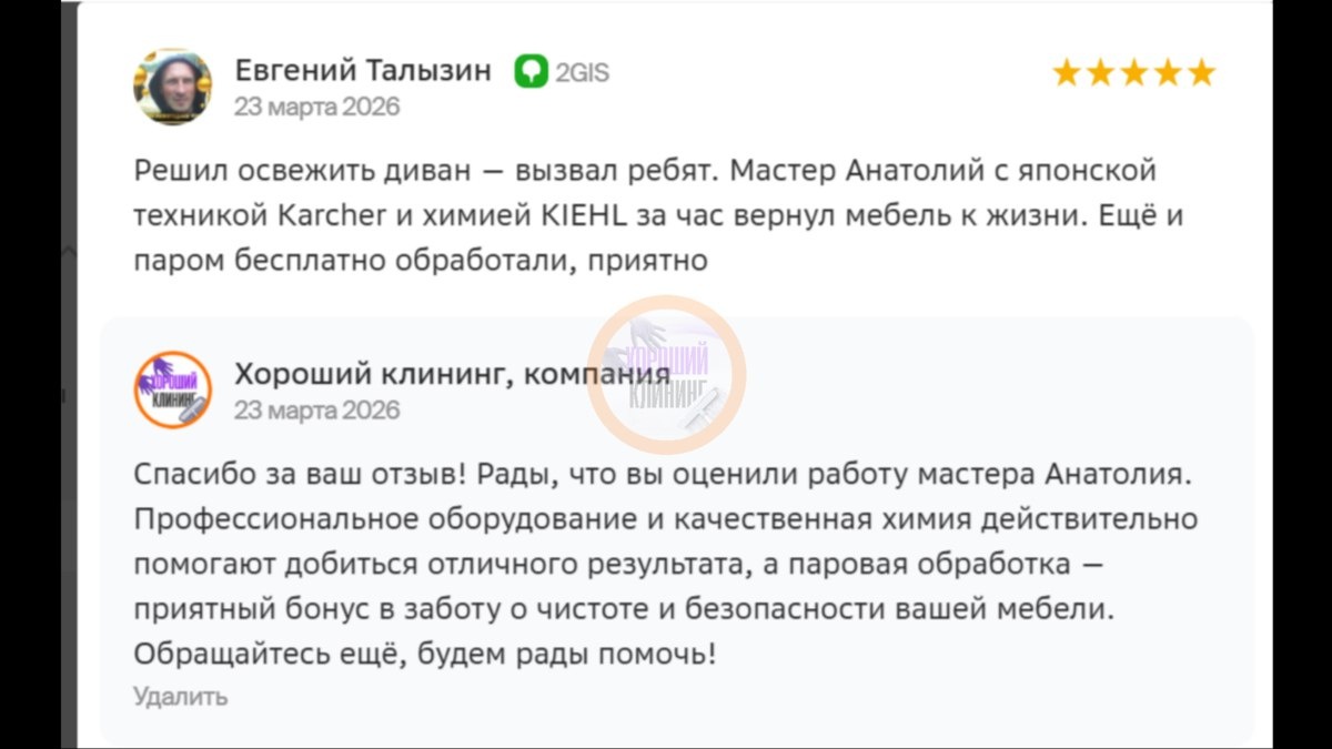 Решили поделиться свежим отзывом от нашего клиента. Приехали освежить диван — уехали с хорошим настроением! Мастер Анатолий отработал на все 100%: ✅ Техника Karcher (надежность) ✅ Химия KIEHL (безопасная и эффективная) ✅ За 1 час диван вернул первозданный вид ✅ Бонус — обработка паром в подарок (гигиена + свежесть) Клиент доволен, диван как новый. Приятно, когда ценят не только результат, но и внимание к деталям. 👉 Нужна химчистка мягкой мебели или уборка? Ждем ваши заявки в личные сообщения. Отзывы в Яндекс.Картах | 2Гис Звоните: +7905-966-55-51 Татьяна Напишите в MAX или в Telegram Подпишитесь MAX | VK | Дзен | YouTube Хороший клининг