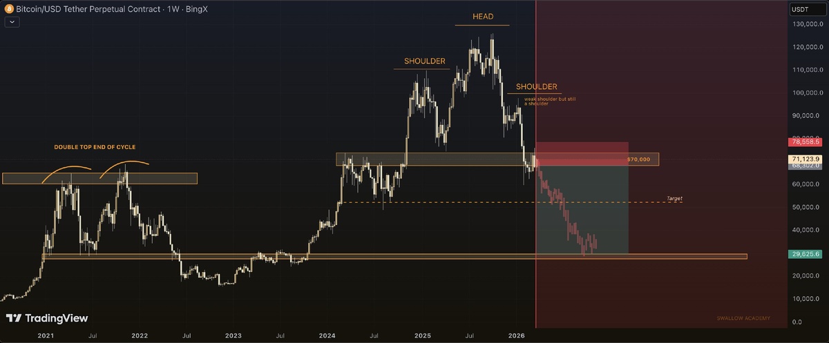 ΠΌΠ°ΠΊΡΠΈΠΌΡΠΌΠΎΠ², Π°Π»ΡΡΠΊΠΎΠΉΠ½Ρ Π½Π΅ ΠΏΠΎΡΠ»Π΅Π΄ΠΎΠ²Π°Π»ΠΈ ΡΡΠΎΠΌΡ ΡΠΎΡΡΡ. π ΠΠ»ΡΡΠ΅Π²ΡΠ΅ ΠΌΠΎΠΌΠ΅Π½ΡΡ: - ΠΠ°Π²Π΅ΡΡΠ΅Π½ΠΈΠ΅ ΠΏΠ°ΡΡΠ΅ΡΠ½Π° Β«ΠΠΎΠ»ΠΎΠ²Π° ΠΈ ΠΏΠ»Π΅ΡΠΈΒ» Π½Π° Π³ΡΠ°ΡΠΈΠΊΠ΅ TradingView, ΡΡΠΎ ΡΠΊΠ°Π·ΡΠ²Π°Π΅Ρ Π½Π° ΠΎΡΠ»Π°Π±Π»Π΅Π½ΠΈΠ΅ ΡΠ΅Π½Ρ ΠΠΈΡΠΊΠΎΠΉΠ½Π°. - ΠΡΠΎΠ³Π½ΠΎΠ· Π΄Π°Π»ΡΠ½Π΅ΠΉΡΠ΅Π³ΠΎ ΡΠ½ΠΈΠΆΠ΅Π½ΠΈΡ ΡΠ΅Π½Ρ. - ΠΠ΅ΡΠ²Π°Ρ ΠΎΡΡΠ°Π½ΠΎΠ²ΠΊΠ° ΠΏΡΠΈ ΠΏΠ°Π΄Π΅Π½ΠΈΠΈ ΠΎΠΆΠΈΠ΄Π°Π΅ΡΡΡ Π½Π° ΡΡΠΎΠ²Π½Π΅ ΠΏΠΎΠ΄Π΄Π΅ΡΠΆΠΊΠΈ $52 300. - ΠΠΎΠ½Π΅ΡΠ½Π°Ρ ΡΠ΅Π»Ρ ΠΏΠ°Π΄Π΅Π½ΠΈΡ β ΠΏΡΠΈΠΌΠ΅ΡΠ½ΠΎ $30 000, Π³Π΄Π΅ ΡΠ΅ΠΊΠΎΠΌΠ΅Π½Π΄ΡΠ΅ΡΡΡ Π½Π°ΡΠ°ΡΡ Π½Π°ΠΊΠΎΠΏΠ»Π΅Π½ΠΈΠ΅ BTC. β οΈ Π ΠΈΡΠΊΠΈ: ΠΡΠΎΠ³Π½ΠΎΠ· ΠΎΡΠ½ΠΎΠ²Π°Π½ Π½Π° ΡΠ΅Ρ