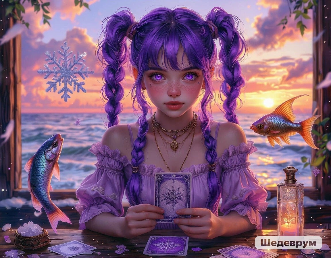 Я же, опишу своё стандартное видение-трактовку. Если почувствуете, что где-то внутри мой текст "откликается" , то так тому и быть. Если ощутите отторжение информации, то прислушивайтесь только к себе🙌. На сегодняшней карте: человек из льда держит огненную снежинку, а над ним зависли рыбы в ночном небе. Человек в сочетании со льдом - холодность, прозрачность, осознанность, огонь - энергия и страсть, снежинка - хладнокровие, рыбы - интуиция, чувства и знаки свыше. День предвещает серьёзный экзамен на выбор между сердцем и разумом, важно не бросаться в крайности. Утром - зарядит энергией контрастный душ, выбери белый, голубой или оранжевый цвет. Днём - благоприятно принимать важные решения, обсуждать "горящие" проблемы, заниматься твор