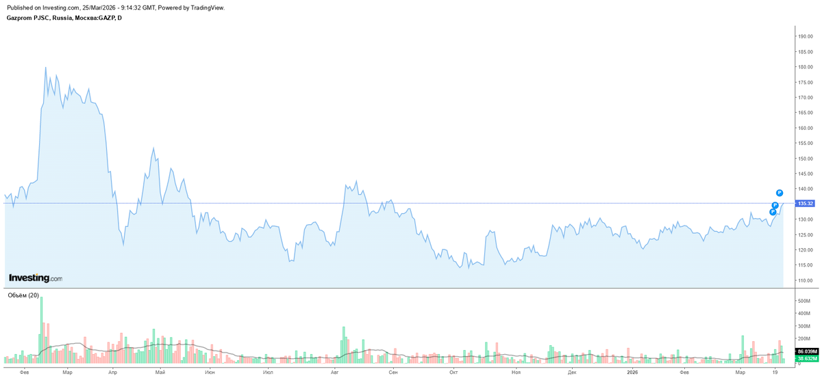 На момент анализа акции Газпрома торгуются по 136,39 рубля. За день цена изменилась на плюс 2,11 рубля, или плюс 1,57 процента. Диапазон дня составил 133,74 – 136,78 рубля. Объем торгов — 24,7 миллиона акций, что выше среднего и подтверждает интерес крупных игроков. Диапазон 52 недель: 111,81 – 167,26 рубля.