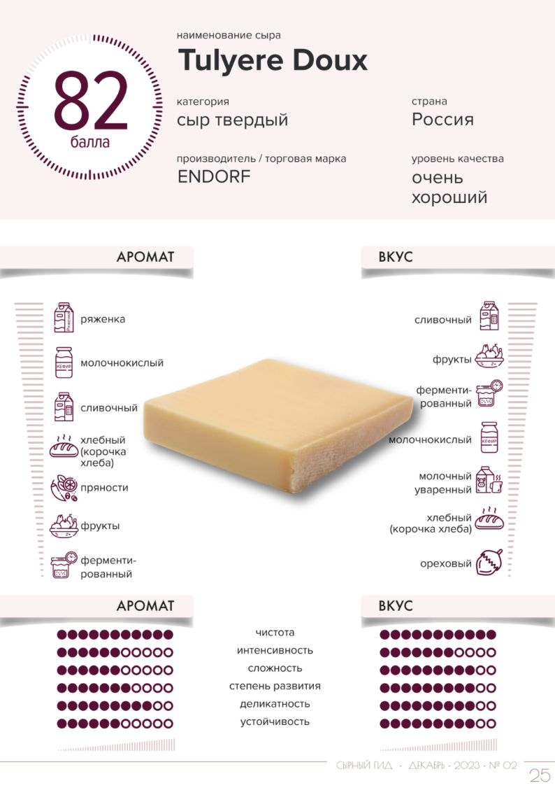 Сыры с длительным сроком созревания - особая категория сыров, где время играет ключевую роль. Именно в процессе выдержки формируются сложный вкус, насыщенный аромат и характерная текстура, отличающие такие сыры от свежих и молодых. Период созревания до 6 месяцев считается оптимальным балансом между мягкостью и выраженностью вкуса: сыр уже успевает приобрести глубину, но при этом сохраняет нежность и пластичность. Разберем некоторые образцы подобных сыров Аромат сыра чистый, средней интенсивности и сложности, достаточно деликатный. В аромате доминируют ряженка, сливочный и молочнокислый тона, с нюансами сдобы, пряностей и ферментированных фруктов. Вкус сыра сложнее и чуть интенсивнее, чем аромат, чистый, деликатный. Вкус сыра полный, хорошо сбалансирован – сладковатый, с хорошей кислотностью, слабосоленый, с выраженной сливочной жирностью. Сыр хорошо раскроется в составе сырной тарелки, в холодных блюдах и брускеттах. Аромат сыра чистый, умеренной интенсивности, сложный, при этом делик